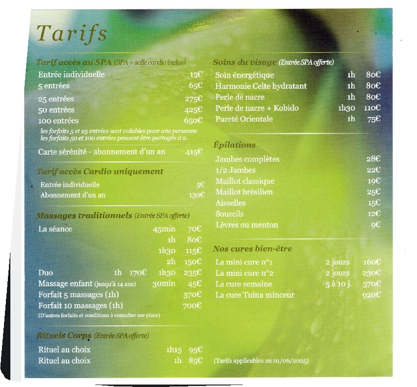 Tous nos soins et massages à la carte, téléchargez la plaquette du spa : le Jardin du bien-être.